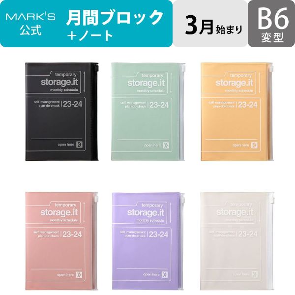 【2】マークス MARK’S/ストレージイット マンスリー+ノートB6変型 2023.03-2024.04/パープル/品番:23SDR-CMU01-PL/1,650円/カバーにスライドジッパー・ポケット複数・ペンホルダー付き・176ページ(約2/3が5mm方眼ノート)・しおり紐1本(公式サイトでは2本となっていますが私が買ったのは1本でした)・他に週間レフトやA5サイズもあり/下に撮りおろし写真あり!